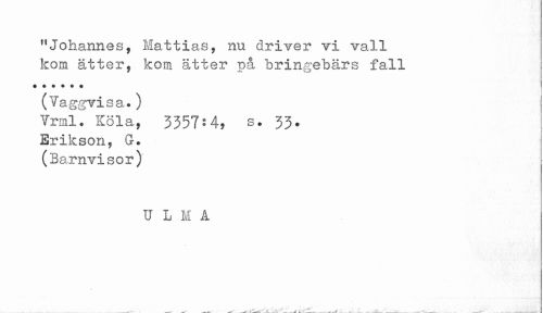 //// "Johannes, Mattias, nu driver vi vall //// kom ätter, kom ätter p& bringebårs fall //// (Vaggvisa.) //// Vrml. Köla, 3357:4, s. 33. //// Erikson, G. //// (Barnvisor) //// U L M A ////