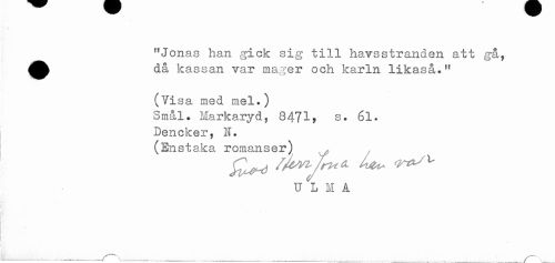 //// "Jonas han gick sig till havsstranden att gå, //// ^^ då kassan var mager och karln likaså." //// (Yisa med mel.) //// Smål. Markaryd, 8471, s. 61. //// Dencker, N. //// (Enstaka romanser) . //// r^ ^ ^^^ //// U L H A //// r . ////