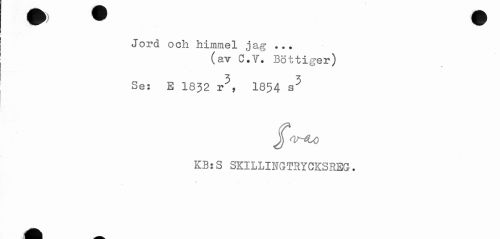 //// I Jord och himmel jag ... //// (av C.V. Bottiger) //// Se: E 1832 r^, 1854 s^ //// KB:S SKILLINGTRYCKSREG. //// T ////