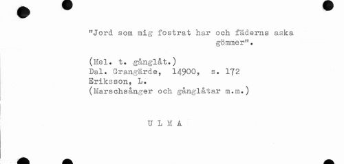 //// "Jord som mig fostrat har och fäderns aska //// gömmer". //// (Mel. t. gånglåt.) //// Dal. Grangårde, 14900, s. 172 //// Eriksson, L. //// (Marschsånger och gånglåtar m.m.) //// i //// U L ä A ////