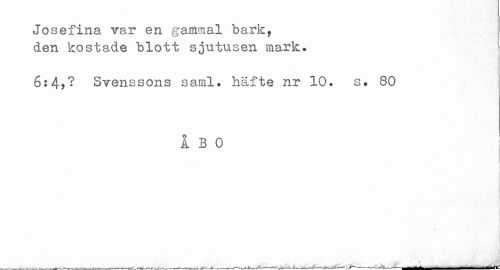 //// Josefina var en gammal bark, //// den kostade blott sjutusen mark. //// 6:4?? Svenssons saml. häfte nr 10. s. 80 //// ABO //// ______________——__„._____—_______——^—-—— - ////