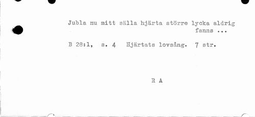 //// : Jubla nu mitt sälla hjärta större lycka aldrig //// fanns . *. //// B 28:1? s. 4 Hjärtats lovsång. 7 str. //// R Å //// _____________ ____.__________________ _________________________________ ___ ___ , ////