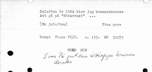 //// ; //// i //// Julafton &r 1884 blev jag kommenderader //// Att gå på "Södervakt" ... //// (En julafton) Utan prov //// Mskpt Visor VIII. s. 133. EU 32072 //// NOBD !JUS //// * Jl^-a ^ ////