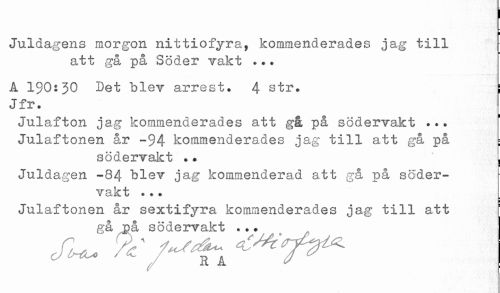 //// Juldagens morgon nittiofyra, kommenderades jag till //// att gå på Söder vakt ... //// A 1$0:30 Det blev arrest. 4 str. : //// Jfr. //// Julafton jag kommenderades att g& på södervakt ... //// Julaftonen år -94 kommenderades jag till att gå på ; //// södervakt .. ^ //// < //// Juldagen -84 blev jag kommenderad att gå på söder- //// vakt ... //// Julaftonen år sextifyra kommenderades jag till att //// gå på södervakt ... ////