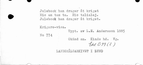 //// a //// Julebock han drager åt kriget //// ^^ Eio am tam ta. Hio talialej. //// ^^ Julebock han drager åt kriget. //// ! //// j //// Krigare-visa. //// Uppt. av L.E. Andersson 188$ //// No 774 //// Okänd sn. Kinds hd. Vg. //// LANDSMÅLSARKIVET I LUND //// ___..... .... ______ _ ________ _________ _________ __________________ ______ ////