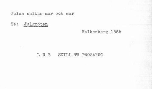 //// Julen nalkas mer och mer //// Se: Julgröten //// —— " ' //// Falkenberg 1886 //// . i //// L U B SKILL TR PROSAREG ////