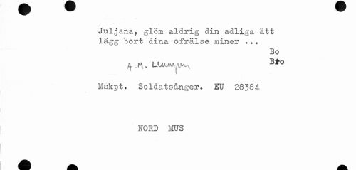 //// Juljana, glöm aldrig din adliga ätt //// lägg bort dina ofrälse miner ... //// Bo //// Mskpt. Soldatsånger. EU 28384 //// NORD ms ////