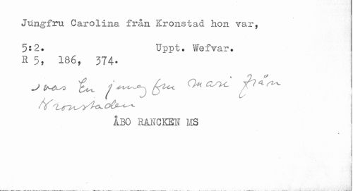 //// Jungfru Carolina från Krönstad hon var, //// 5:2. Uppt. Wefvar. //// R 186, 374- //// ÅBO RANCKEN EIS ////