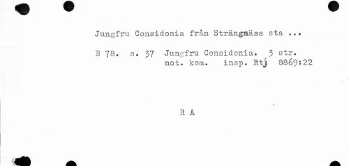 //// Jungfru Considonia från Strängnäsa sta ... //// B 78. s. 37 Jungfru Considonia. 3 str. //// not. kom. insp. Rtj 8869:22 //// \ //// R A //// ^^^fi - . ..... ^^ ^^ ----^^ ////
