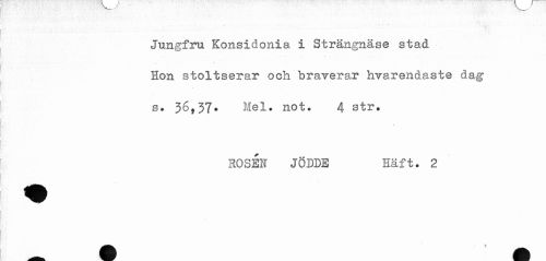 //// Jungfru Konsidonia i Strängnäse stad //// Hon stoltserar och braverar hvarendaste dag //// s* 36,37* Hel. not. 4 str. //// ROSÉN JÖDDE Häft. 2 //// * //// ! ////