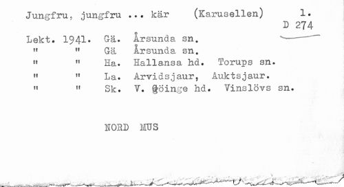 //// Jungfru, jungfru ... kär (Karusellen; 1. //// D 274 //// Lekt. 1941. Gä. Arsunda sn. ---— //// " " Gä Arsunda sn. //// n " Ha. Hallansa hd. Torups sn. //// " ^ La. Arvidsjaur^ Auktsjaur. //// " " Sk. V. göinge hd. Vinslövs sn. //// NORD EKIS ////