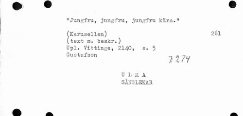 //// ^—< - . - * //// "Jungfru, jungfru, jungfru kära." //// (Karusellen) 26l //// (text m. beskr.) //// Upl. Vittinge, 2140, s. 5 //// Gustafson ^ A //// / ^ / 7 //// U L H A //// SÅNGLEKAR ////