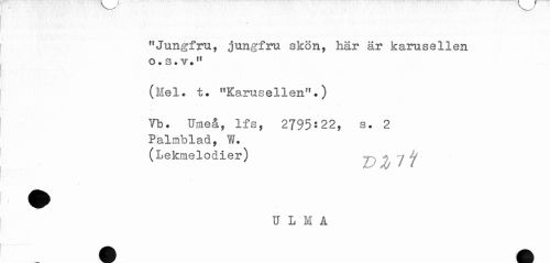 //// "Jungfru, jungfru skön, här är karusellen //// o.s.v." //// (Mel. t. "Karusellen".) //// Vb. Umeå, Ifs, 2795:22, s. 2 //// Palmblad, W. //// (Lekmelodier) //// U L M A ////