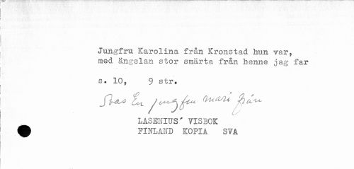 //// i . ... . . ' - . . //// ] //// t //// t //// Jungfru Karolina från Krönstad hun var, //// med. ängslan stor smärta från henne jag far //// s. 10, 9 str. //// LASENIUS' VISBOK //// ' ^ FIITLAND KOPIA SVA ////