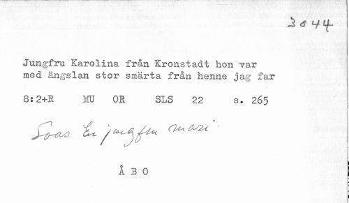 //// Jungfru Karolina från Kronstadt hon var //// med ängslan stor smärta från henne jag far //// 8:2+R HU OR SLS 22 s. 265 ////