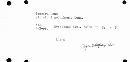 //// Jungfru Lena //// går sig i grönskande lund, //// H^Fors. Svenssons saml. häfte nr s. 9 //// ÅBO ////