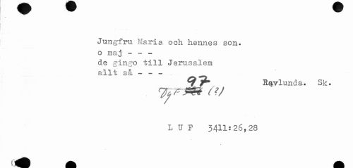 //// Jungfru Maria och hennes son. //// o maj - - - //// de gingo till Jerusalem //// allt så - - - //// ^ ^T* Ravlunda. Sk. //// L U F 3411:26,28 ////