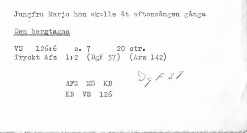 //// Jungfru. Har jo hon skulle åt aftonsången gånga //// * //// Den berfrta. na, //// VS 126:6 s. 7 20 str. //// Tryckt Afz 1:2 (DgF 37) (Arw 142) //// AFZ MS KB / //// KB VS 126 ////