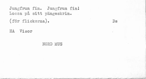 //// Jungfrun fin. Jungfrun fini //// Lossa på sitt pängeskrin. //// (för flickorna). Ds //// HA Visor , j //// NORD HUS ////