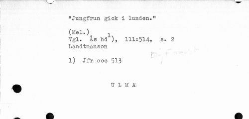 //// "Jungfrun gick i lunden." //// (Mel.) . //// ?gl. Ås hd ), 111:514, s. 2 //// Landtmanson //// y* //// 1) Jfr acc 513 //// ^ U L M A //// . ////