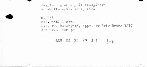 //// Jungfrun gick sig åt trådgården //// o. skulle skåra strå, strå //// mel. not. 1 str. //// mel. fr. östergtld, uppt. a,v Erik Drake 1817 //// Jfr Sv.L. Bok 48 //// ARW MS KB VS 2:2 ^p //// i //// t //// ,______ _ _ __.______........................................... .. ___________________ r^ ////