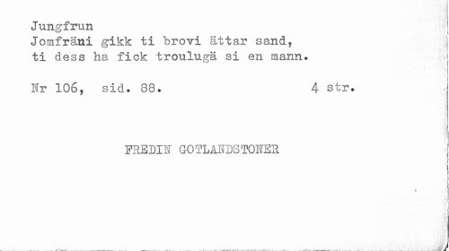 //// Jungfrun //// Jomfräni gikk ti brovi ättar sand, //// ti dess ha fick troulugä si en mann. //// Nr 106, sid. 88. 4 str. //// FREDIH GOTLANDSTONER //// , //// . //// . //// ^ ___. . . ..-jgj ////