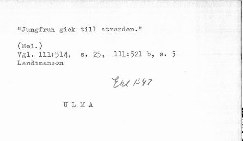 //// "Jungfrun gick till stranden." //// (Mel.) //// Vgl. 111:514, s. 25? 111:521 b, s. 5 //// Landtmanson //// U L M A //// < ////