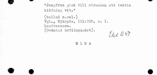 //// "Jungfrun gick till stranden att tvätta //// klådning vit." //// (ballad m.mel.) //// Vgl.y Hjärpås, 111:200, s. 1. //// Landtmanson. //// (Oväntad bröllopsgäst). , . //// U L M A ////