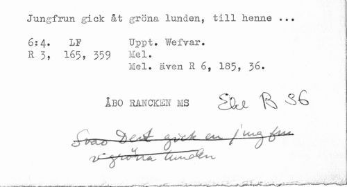 //// Jungfrun gick åt gröna lunden, till henne ... //// 6.: 4. LF Uppt. Wefvar. //// R 3, 165, 359 Hel. //// Mel. även R 6, 185, 36. //// ÅBO RANCKEN MS ^ ^^ ////