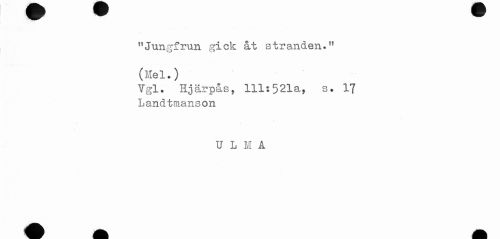 //// "Jungfrun gick åt stranden." //// (Mel.) //// Vgl. Hjärpås, 111:521a, s. 17 //// Landtmanson //// U L M A ////