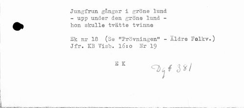 //// Jungfrun gångar i grö ne lund //// - upp under den gröne lund - //// ^^ hon skulle tvätte tvinne //// Ek nr 18 (Se "Prövningen" - Äldre Folkv.) //// Jfr. KB Visb. l6:o Nr 1$ //// [ ////