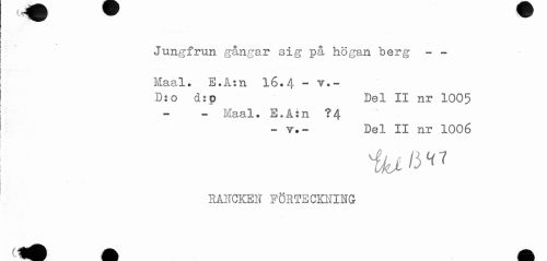 //// Jungfrun g&ngar sig på högan berg - - //// Maa 1. E.Å:n 16.4 - v.- //// D:o d:p Del II nr 1005 //// - Maal. E.A:n ?4 //// - v.- Del II nr 1006 //// t //// i //// i //// RANCKEN FÖRTECKNING ////