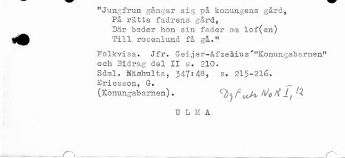 //// 'Jungirun gangar sig pa konungens gard, //// På rätta fadrens gård. //// Där beder hon sin fader om lof(en) //// gjj^ Till rosenlund f& gå." //// Folkvisa. Jfr. Gei jer-Af zeMus^"Konungabarnen" //// och Bidrag del II s. 210. //// Sdml. Nåshulta, 347:48, s. 215-216. //// Ericsson, G. ^ //// (Konungabarnen) . ^ //// U L N A ////