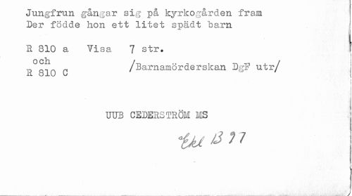 //// Jungirun gangar sig pa Kyrkogarden iram //// Der födde hon ett litet spådt barn //// R 810 a Visa 7 str. t //// ! //// n^oT^ r^ /Barnamörderskan DgF utr/ j //// K o10 U < //// j //// UUB CEDERSTRÖM HS j ////