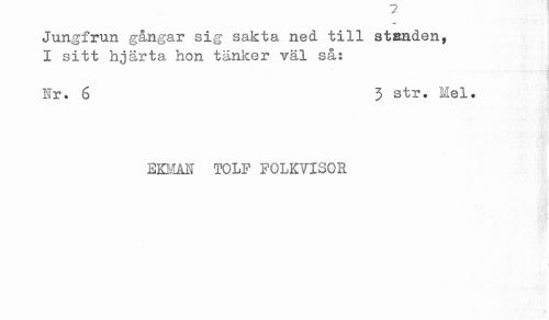 //// Jungfrun gångar sig sakta ned till stånden, //// I sitt hjärta hon tänker väl så: //// Nr. 6 3 str. Mel. //// EKMAN TOLF FOLKVISOR ////