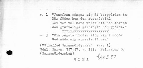 //// A - . ' " ' .... ... //// ........... . //// ' - ' * * ' * -..... " ' - ' ' ' ' //// . " ' . . -' - //// v. 1 "Jungfrun gångar sig åt borggården in //// Där foder hon den rosendskind //// Det var väl mera under att hon tordes //// den grufveliga gärningen hon gjorde." //// xxxxxxxxxxxxxxxxxxxxxxx //// v. 3 "Min yngsta broder slog mig i bojor //// Gud nåda mig armaste fånge." //// ("Straffad Barnamorderska" Var. A) //// ^ Sdml. Barva, 347^47? s. 127* Ericsson, G. //// ^y) (Bamamörderskan) / ////