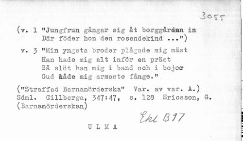 //// (v. 1 "Jungfrun gångar sig åt borggåråmi in //// Dar foder hon den rosendekind ...") //// v. 3 "Min yngsta broder plågade mig rnäst //// Han hade mig alt inför en präst //// Så slöt han mig i band och i bojoar //// Gud Aåde mig armaste fånge." //// ("Straffad Barnamörderska" Var. av var. A.) //// Sdml. Gillberga, 347:47? s. 128 Ericsson, G. //// (Barnamorderskan) ////