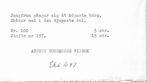 //// Jungfrun gångar sig åt högaste bårg, //// Skådar ned i den djupaste dal. //// Nr. 100 5 str. //// Jämför nr 197, 15 str. //// AUGUST BONDESONS VISBOK //// ..........-________-______. - —- __^ ////