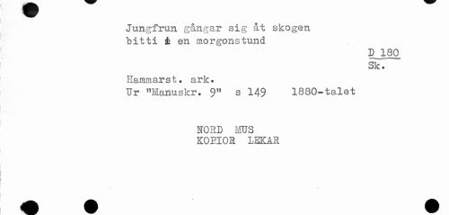 //// Jungfrun gångar sig at skogen //// bitti i en morgonstund //// D JL80 //// Sk. //// Hammarst. ark. //// Ur "Manuskr. 9" s 149 1880-talet //// NORD MUS //// KOBIOR LEKAR //// i //// K ////