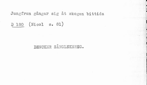 //// ) //// Jungfrun gångar sig åt skogen bittida //// p 180 (Nicol s. 81) //// < //// DENCKER SÅNGLEKSREG. //// - ////