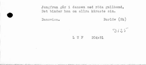 //// Jungfrun går i dansen med röda gullband. //// Det binder hon om allra käraste sin. //// Dansvisa. Burlöv (Sk) //// i //// L U F 204:81 //// i //// ! - //// I //// i ////