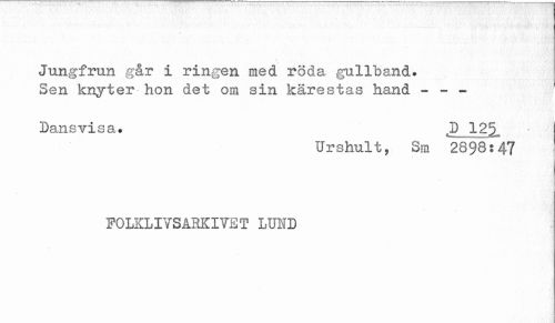 //// Jungfrun gar i ringen med röda gullband. //// Sen knyter hon det om sin kärestas hand - - - //// Dans vi sa. 12^ //// Urshult, Sm 2898^47 //// FOLKLIVSARKIVET LUND ////