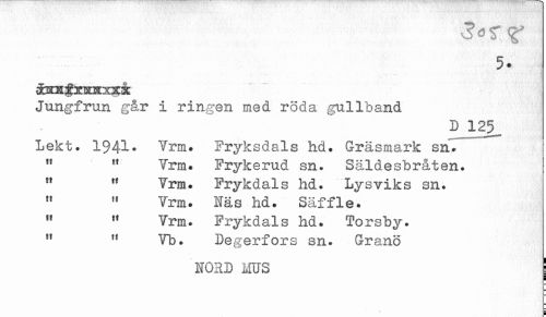 //// Jungfrun gar i ringen med röda gullband //// D 125 //// Lekt. Vrm. Fryksdals hd. Gräsmark sn. //// " " Vrm. Frykerud sn. Säldesbråten. //// " " Vrm. Frykdals hd. Lysviks sn. //// " " Vrm. Näs hd. Säffle. //// " " Vrm. Frykdals hd. Torsby. //// " '* Vb. Degerfors sn. Granö //// NORD ms ////