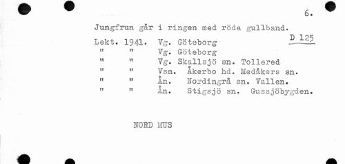 //// - 6 + //// Jungfrun går i ringen med röda gullband. //// Lekt. 1941. Vg. Göteborg ^JLEl //// " " Vg. Göteborg //// " " Vg. Skallsjö sn. Tollered //// " " Vsm. Åkerbo hd. Hedåkers sn. //// " " An. Nordin,grå sn. Vallen. //// o //// " " An. Stigsjö sn. Gussjöbygden. //// * //// NORD MUS ////