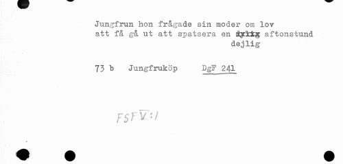 //// Jungfrun hon frågade sin moder om lov //// att få gå ut att spatsera en åyikig aftonstund //// dejlig //// 73 b Jungfruköp DgF 241 ////