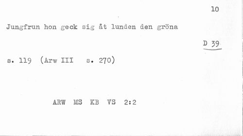 //// 10 //// Jungfrun hon geck sig &t lunden den gröna //// D 39^ I //// s. 119 (Arw III s. 270) //// ! //// ARW MS KB VS 2:2 ////