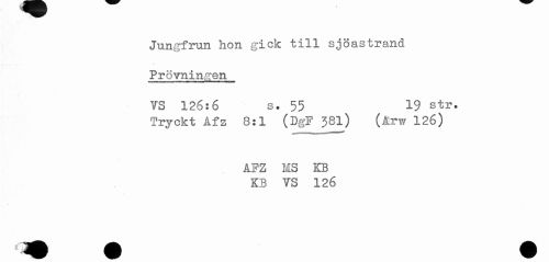 //// Jungfrun hon gick till sjöastrand //// Prövningen //// VS 126:6 s. 55 19 str. //// Tryckt Afz 8:1 (DgF 38I) (Arw 126) //// AFZ MS KB //// KB VS 126 ////