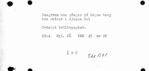 //// \ //// Jungfrun hon gångar på högan berg //// hon skådar i djupan dal //// Oväntad bröllopsgäst. //// 19:4 Nyl. JÅ INE 45 nr 28 //// I //// I //// I ////