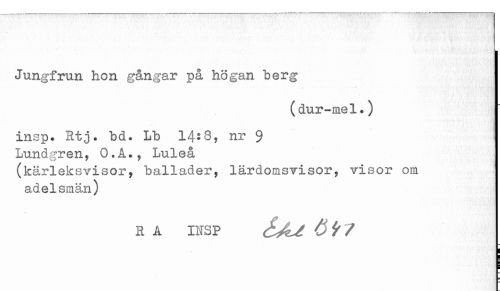 //// - //// Jungfrun hon gångar på högan berg //// (dur-mel.) //// insp. Rtj. bd. Lb 14^S, nr 9 //// Lundgren, O.A., Luleå //// (kärleksvisor, ballader, lärdomsvisor, visor om //// adelsmän) //// RA INSP ////