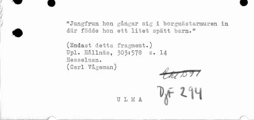 //// v "Jungfrun hon gångar sig i borgmästarmuren in //// ^^^ där födde hon ett litet spätt barn." //// < //// j //// (Endast detta fragment.) //// Upl. Hållnas, 303:578 s. 14 //// Hesselman. //// (Carl Vågeman) ^ .......... //// U L M A * * //// ^ - ////